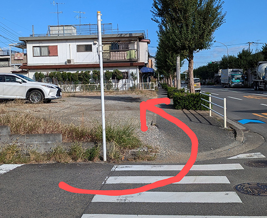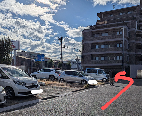 交差点を越えて、すぐ左手にマンションがあり、越えてすぐ左手の駐車場になります。